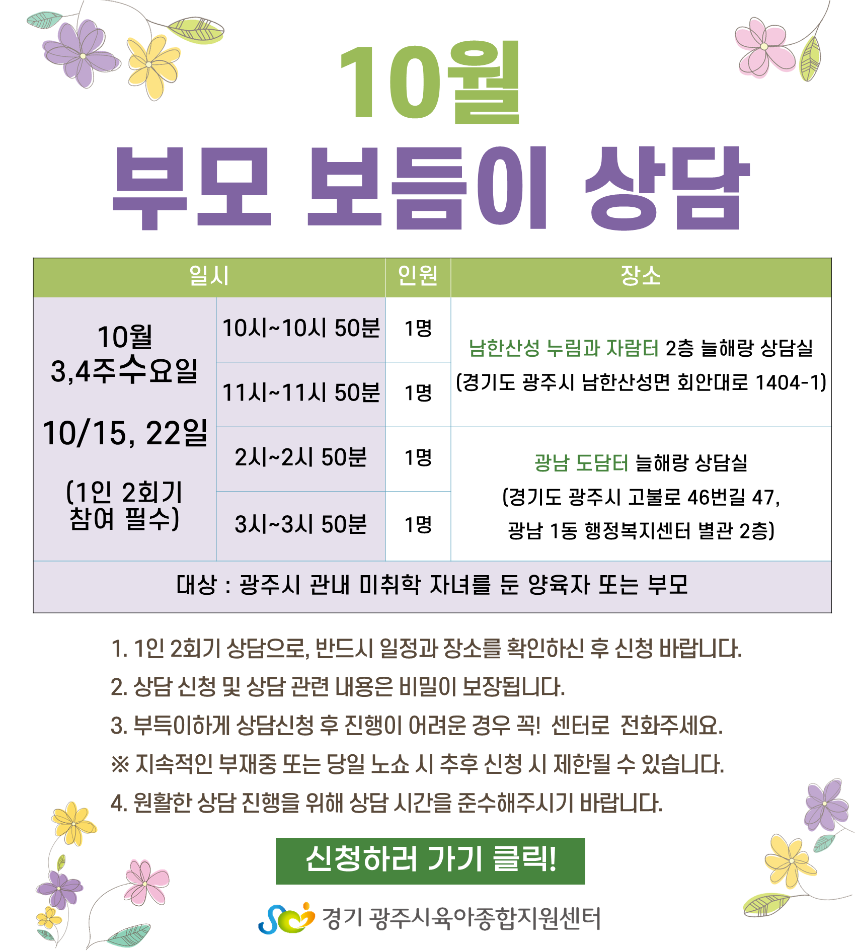 점심시간 - 12:00~13:00, 휴관일 - 일요일, 월요일, 근로자의 날, 법정공휴일 - 주소경기도 광주시 고불로 46번길 47(광남1동행정복지센터별관 2층)