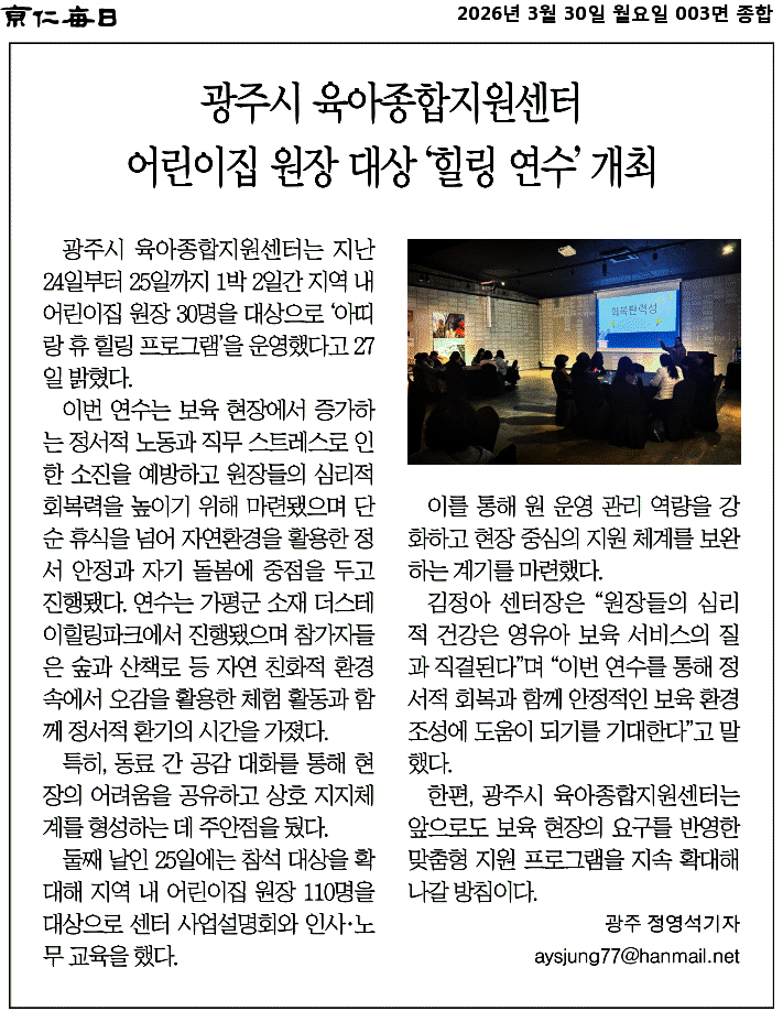 광주시 육아종합지원센터, 어린이집 원장 대상 '힐링 연수' 개최:내일을여는신문