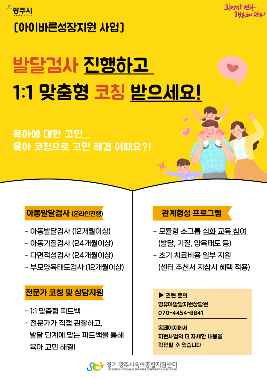 ▶ 광주시 관내 아동 12개월 ~ 취학 전 아동을 대상으로 연1회 아동발달검사를 무료 지원합니다.