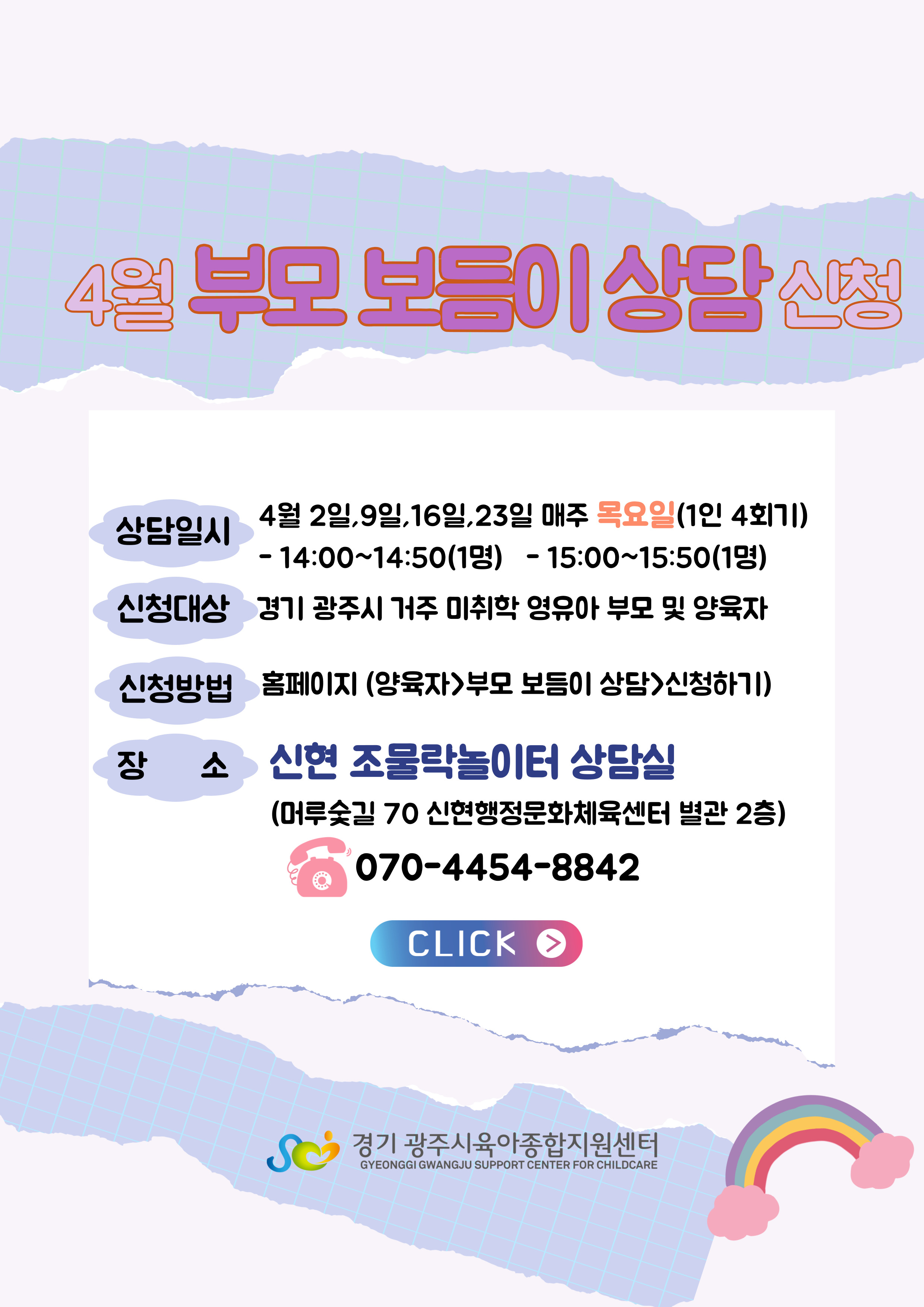 2. 부득이하게 상담 신청 후 진행이 어려운 경우 꼭 센터로 연락주시기 바랍니다.