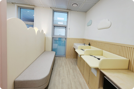 기저귀 교환대, 세면대, 전자레인지, 냉장고, 이유식 의자 등이 비치된 공간