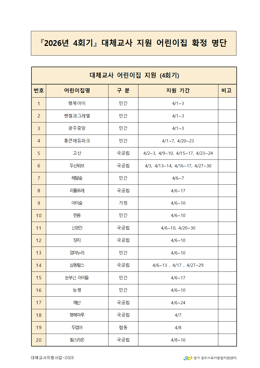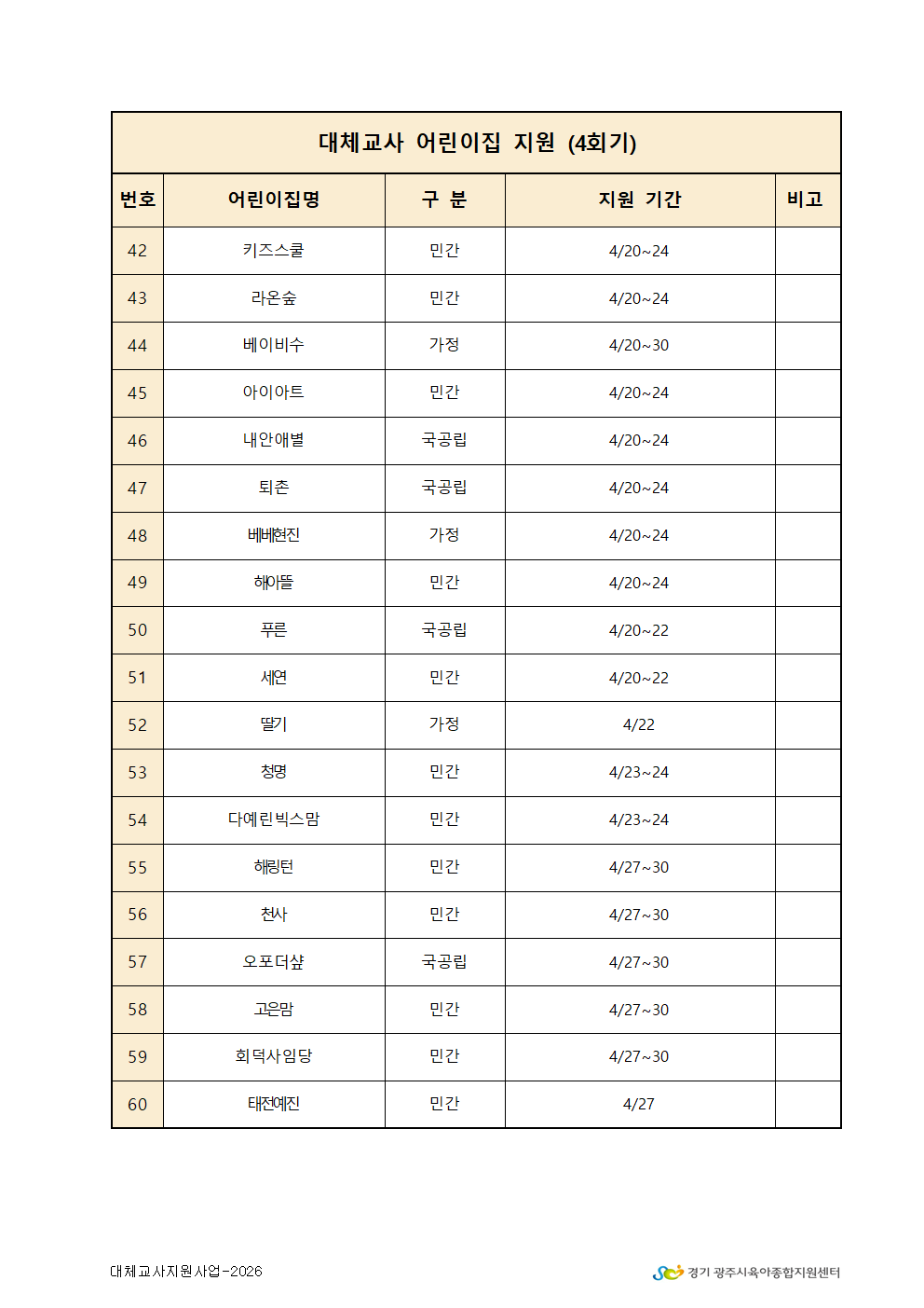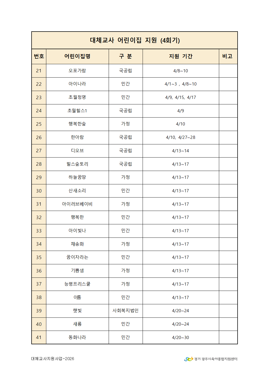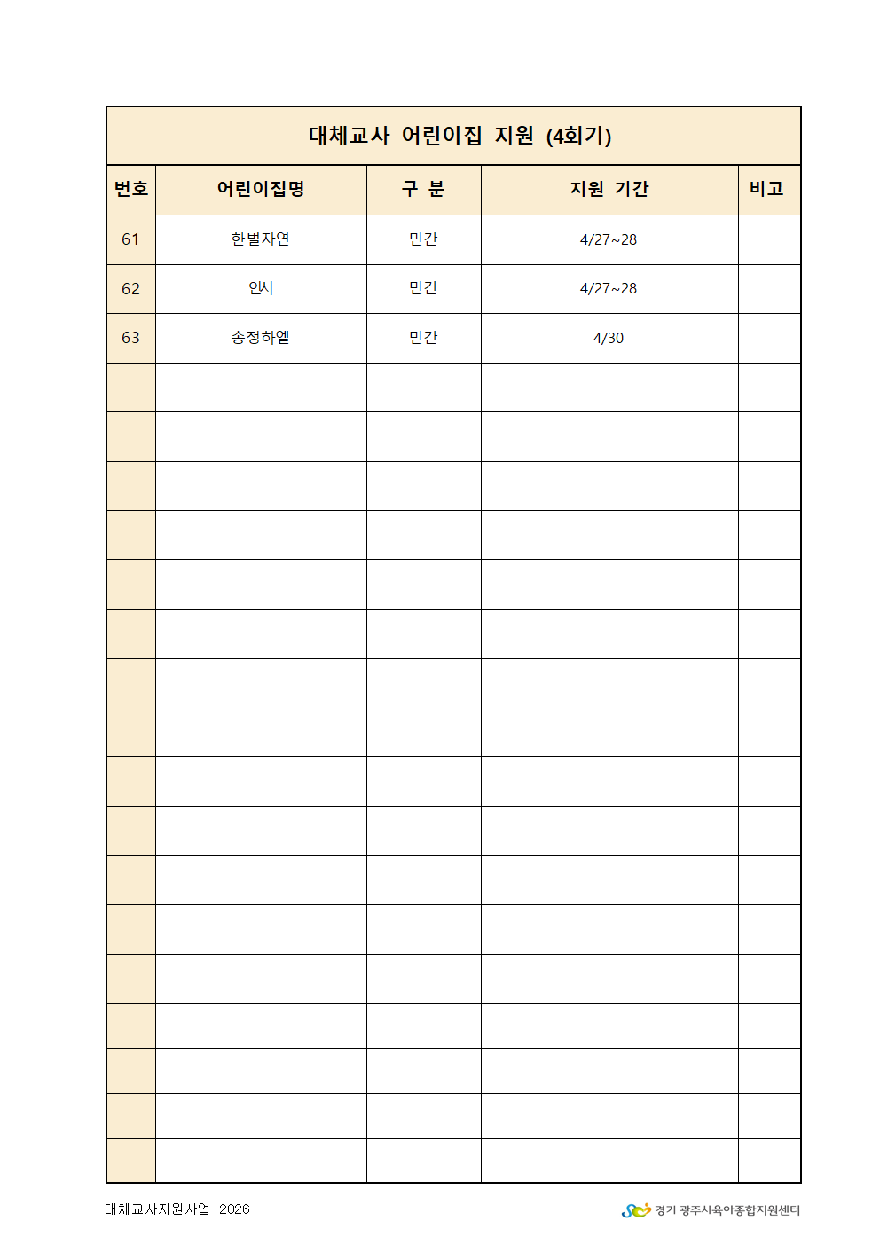 2026년 4회기 대체교사 지원 확정 어린이집
