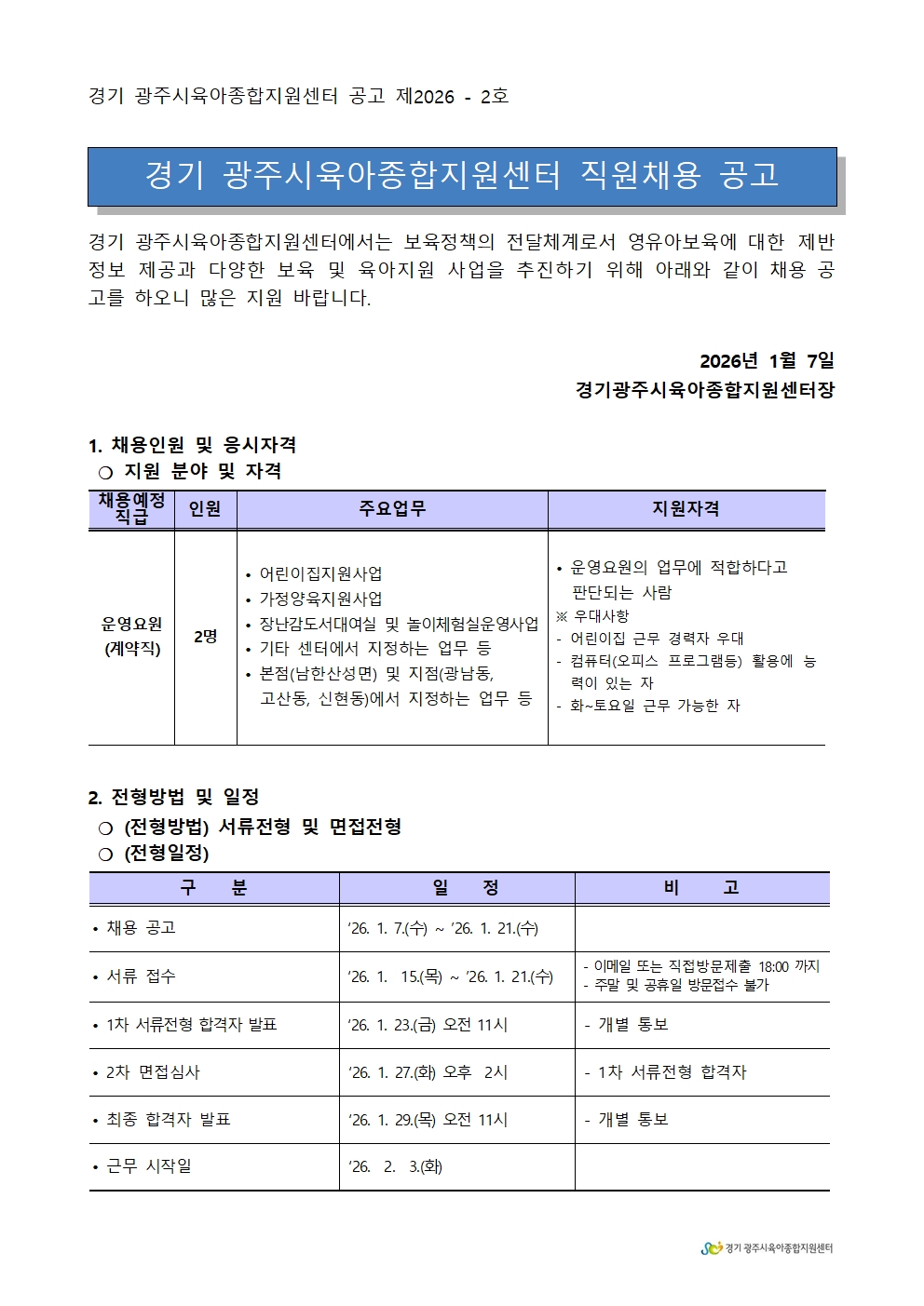 <경기광주시육아종합지원센터> 직원채용공고 2026-2호 (운영요원)