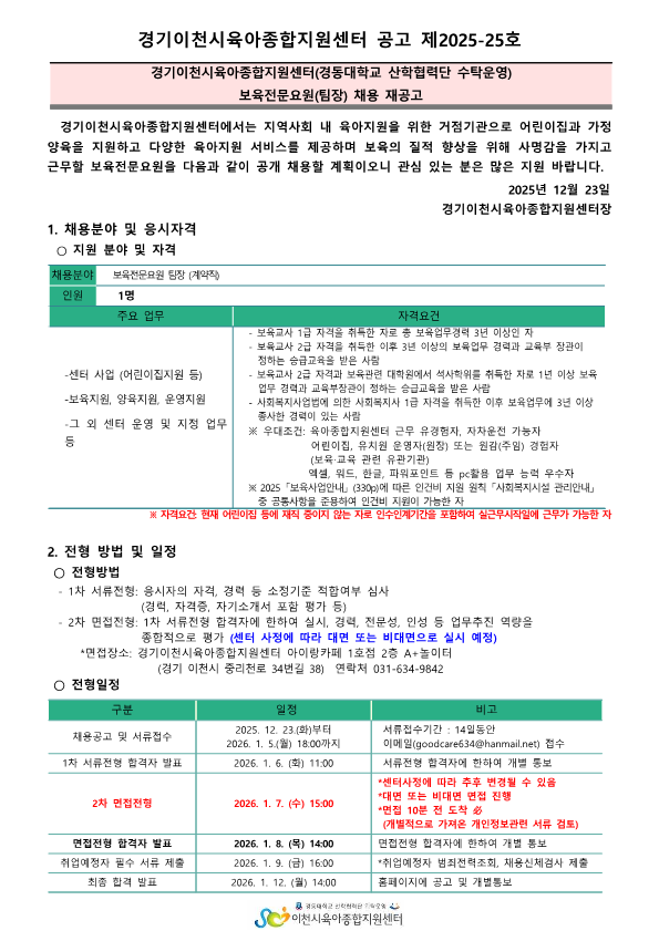 붙임 1. 공고 제2025-25호_이천시육아종합지원센터_보육전문요원(팀장)_채용.pdf