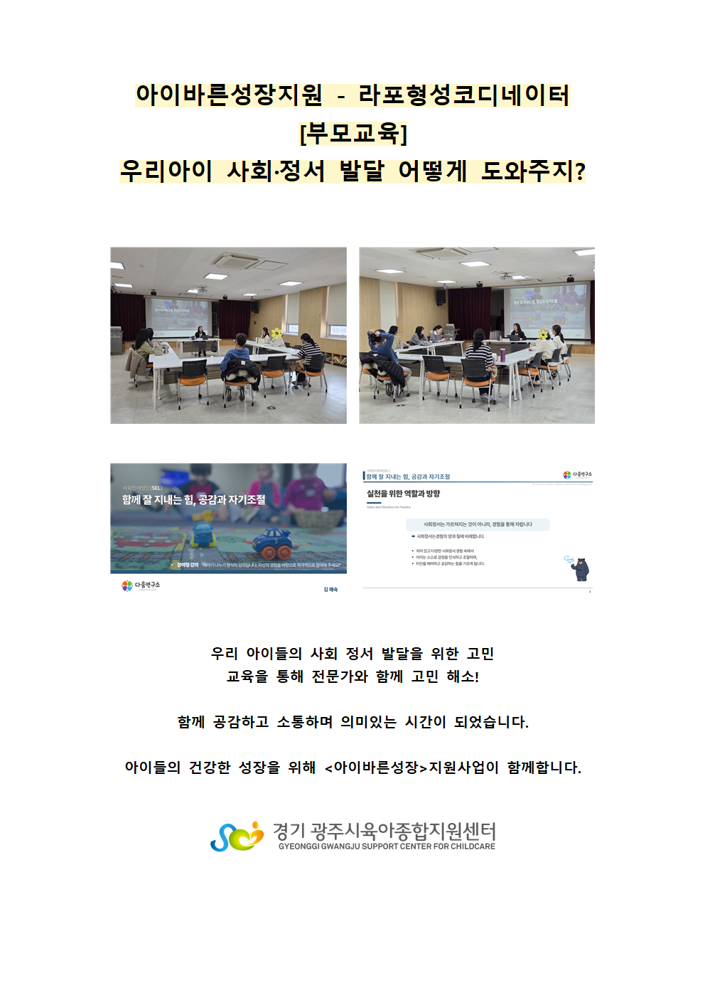 [남한산성] [아이바른성장] 부모모듈교육 "우리 아이 사회정서 어떻게 도와주지?"