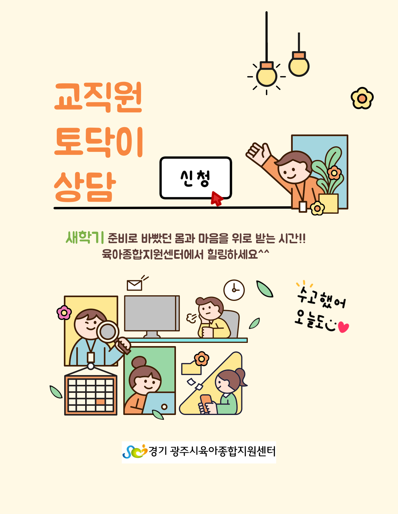 - 단, 부득이하게 상담 신청 후 상담 진행이 어려운 경우 상담 일정 조정은 최소 1일 전 꼭! 센터로 전화주시기 바랍니다.